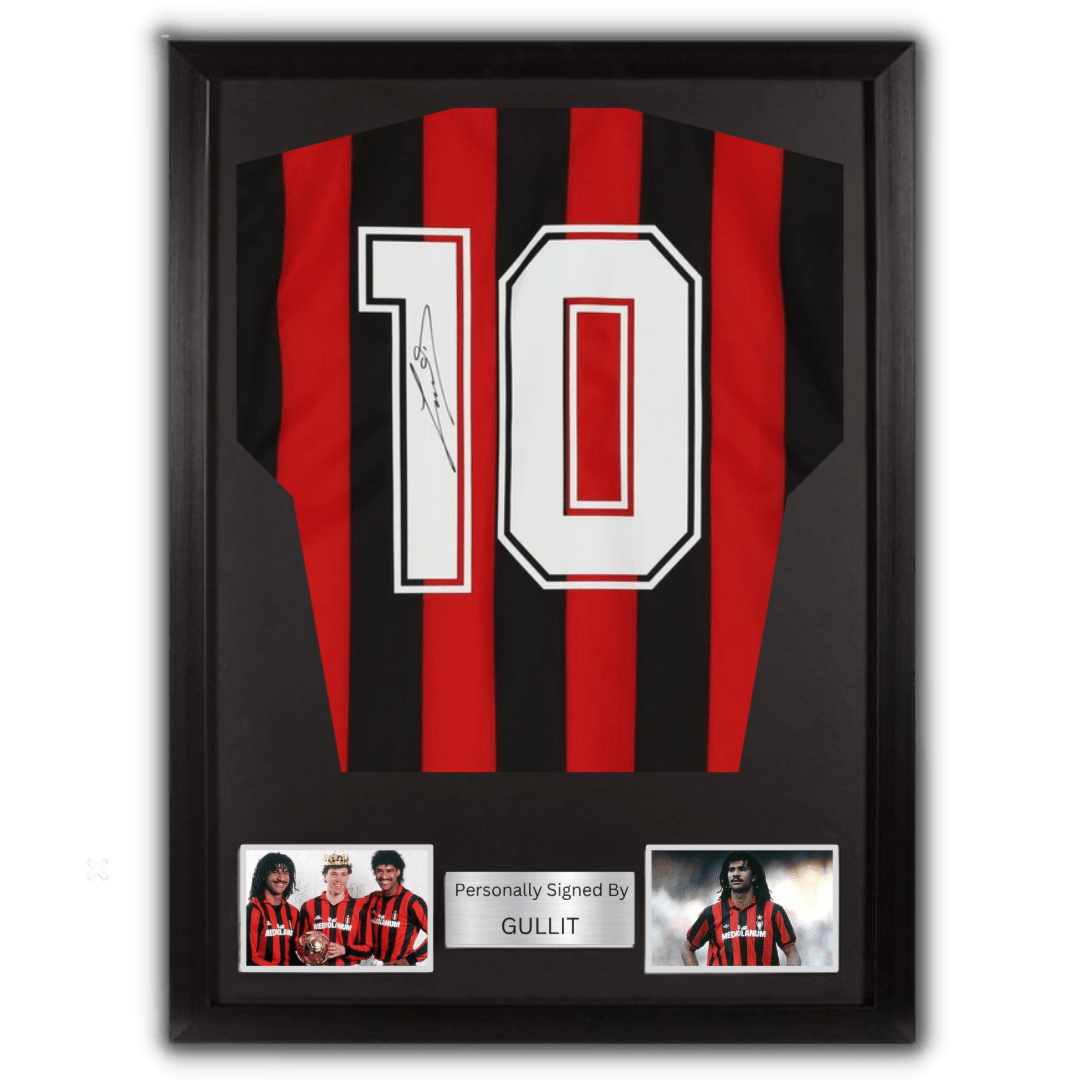 Ac Milan jersey hand signed by Gullit (with certificate of authenticity) This product comes without a frame, if you wish to add a frame you can do so by choosing Add frame before adding the product to the cart المنتج يأتي بدون برواز، وإذا رغبت بإضافة برواز كما هو موضح في الصورة يمكنك القيام بذلك عبر اختيار إضافة إطار (Add frame) قبل إضافة المنتج إلى سلة التسوّق
