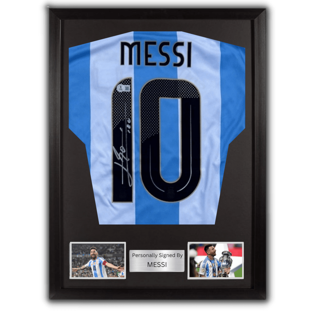 Argentina jersey hand signed by Messi (with certificate of authenticity) This product comes without a frame, if you wish to add a frame you can do so by choosing Add frame before adding the product to the cart المنتج يأتي بدون برواز، وإذا رغبت بإضافة برواز كما هو موضح في الصورة يمكنك القيام بذلك عبر اختيار إضافة إطار (Add frame) قبل إضافة المنتج إلى سلة التسوّق