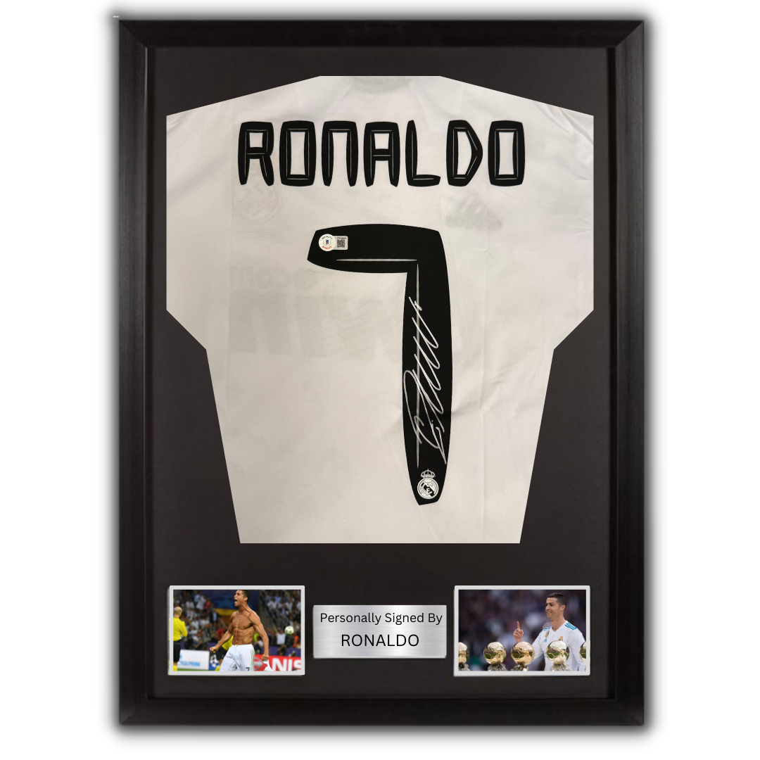 Real Madrid jersey hand signed by Ronaldo (with certificate of authenticity) Frame average size: 82 x 66 cm Please note that this product takes 3 days preparation + Delivery time