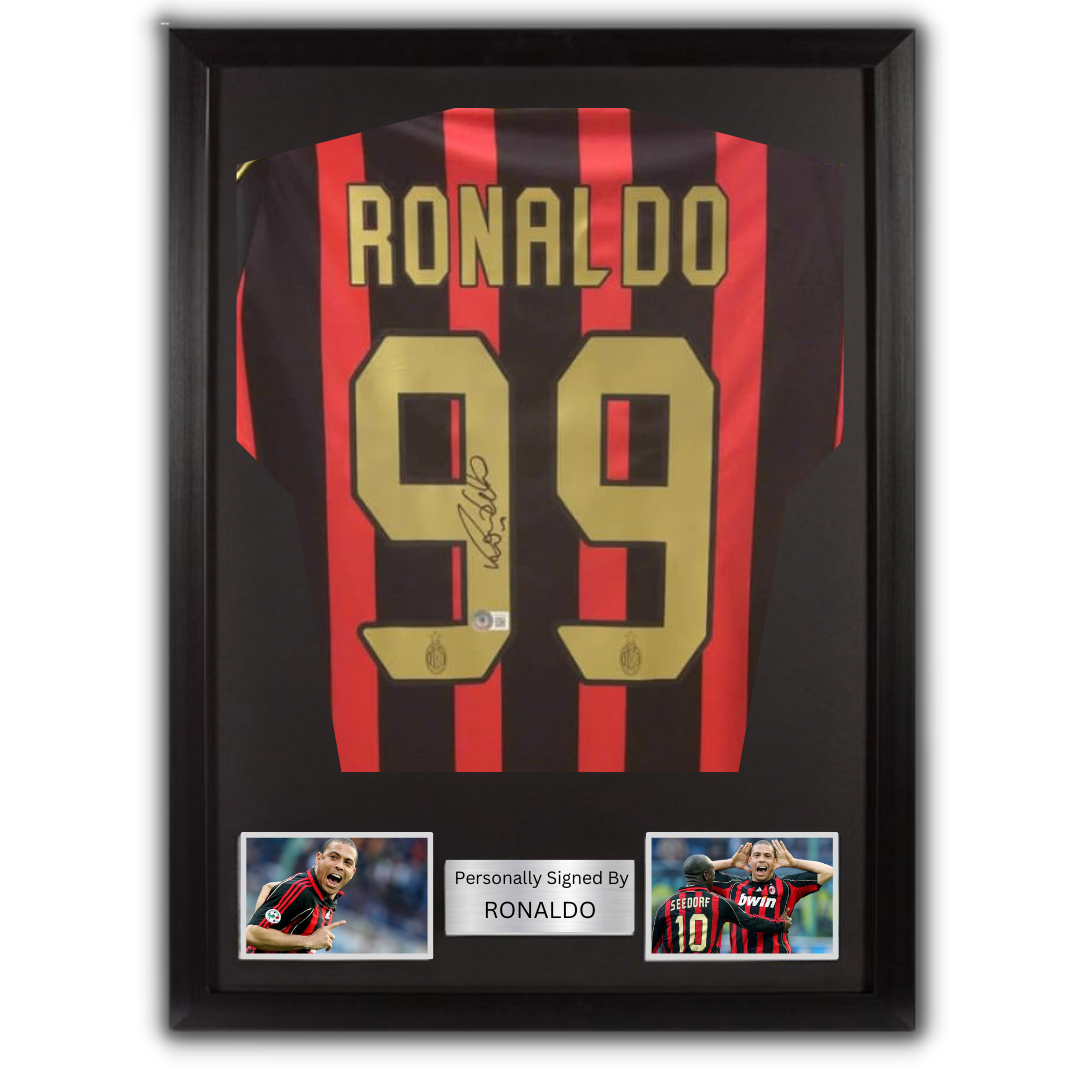 Ac Milan jersey hand signed by Ronaldo Nazario (with certificate of authenticity) Frame average size: 82 x 66 cm Please note that this product takes 3 days preparation + Delivery time For further information please contact @Vamos.tickets on instagram