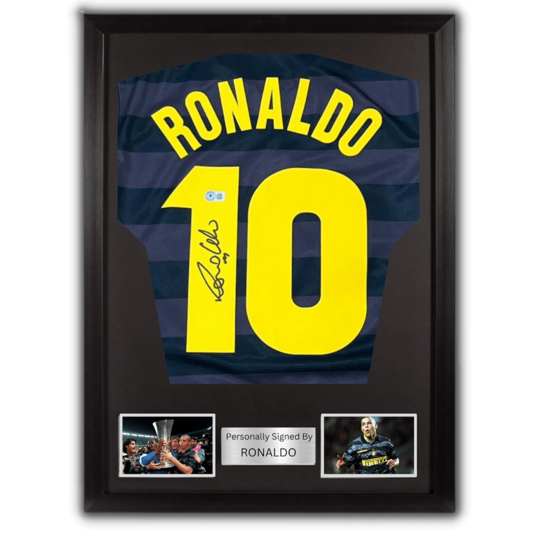 Inter Milan jersey hand signed by Ronaldo Nazario (with certificate of authenticity) Frame average size: 82 x 66 cm Please note that this product takes 3 days preparation + Delivery time For further information please contact @Vamos.tickets on instagram